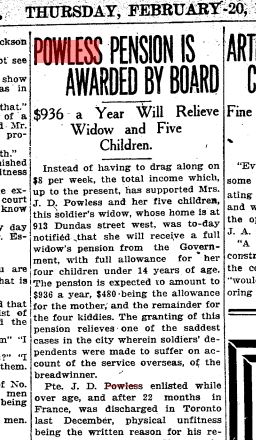 A full pension of $936/year was granted to Mrs. Powless and her children after supporters had the case reopened. Another report appeared in the Toronto Star on February 20th 1919, in part: