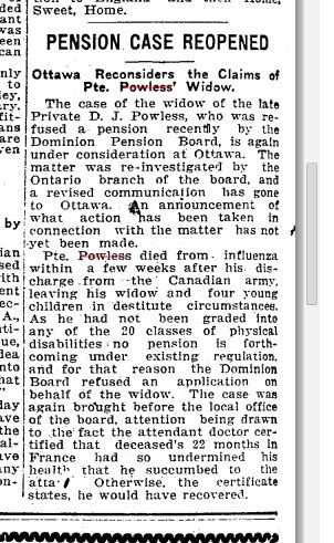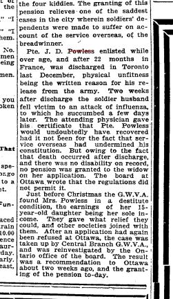Pte. J. D. Powless enlisted while over age, and after 22 months in France, was discharged in Toronto last December, physical unfitness being the written reason for his release from the army. Two weeks after discharge the soldier husband fell victim to an attack of influenza, to which he succumbed a few days later. The attending physician gave his certificate that Pte. Powless would undoubtedly have recovered had it not been for the fact that service overseas had undermined his constitution. But owing to the fact that death occurred after discharge, and there was no disability on record, no pension was granted to the widow on her application. The board at Ottawa wrote that the regulations did not permit it.