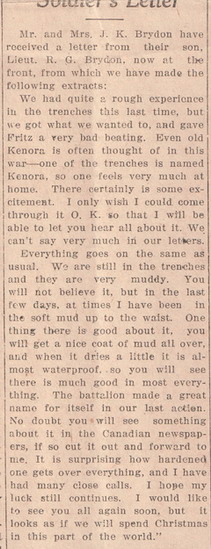 The 102nd spent only a short time in England before being sent to France as part of the new 4th Canadian Division. They disembarked at Le Havre on 12 August and three days later they were in Belgium. The men were given training in trench warfare and by 21 August the unit had already suffered 25 casualties, including five men killed. The Somme Offensive started in July and the first three Canadian Divisions were moved to the Somme area in late August and early September. After several unsuccessful attempts to capture Regina Trench the troops were relieved in mid-October by the 4th Canadian Division. The 102nd Battalion went into the trenches on 18 October but due to very heavy rain the operation planned for the next day was postponed until noon on 21 October. The 102nd took part in the assault, capturing part of Regina Trench, and they held on until being relieved on 23 October. The men were exhausted from the muddy conditions and the cold, wet weather. From the War Diary of the 102nd Battalion, 24 October 1916, "The following recommendations for honours were made to Brigade Headquarters:- For the Military Cross :- Lieut. Robert George Howie Brydon." Robert did not receive a Military Cross but five men in his unit were awarded Military Medals "for conspicuous bravery displayed during the assault on Regina Trench."
