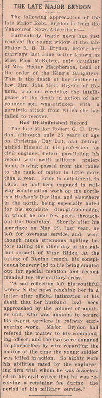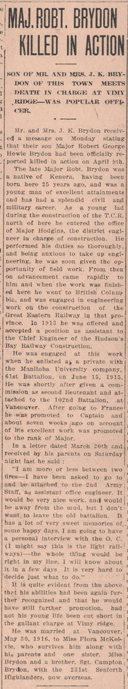 Major Robert George Howie Brydon was working as a civil engineer when he received a commission as a Lieutenant in the 102nd Battalion in May 1916. He died less than a year later at the Battle of Vimy Ridge.