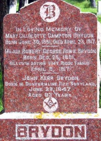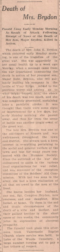 When Mrs. Brydon learned of her son's death she suffered a paralytic stroke and never recovered. She died on 23 April 1917, exactly two weeks after Robert. Her husband passed away in 1930 and they are both buried in Lake of the Woods Cemetery in Kenora. Their oldest son John Campton also served in the war. He enlisted with the 231st Battalion in March 1916 while he was living in Vancouver and he survived the war. He passed away in 1956 and is buried in Lake of the Woods Cemetery.