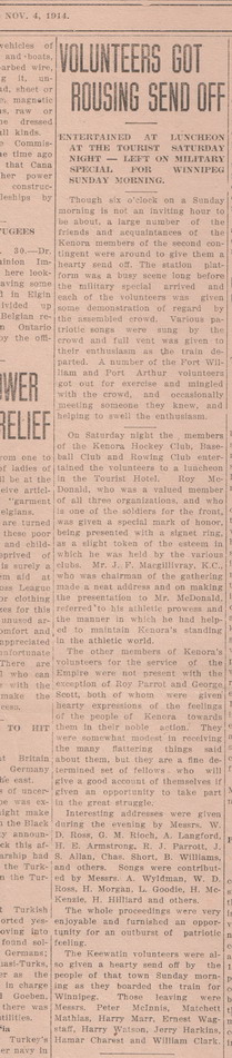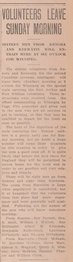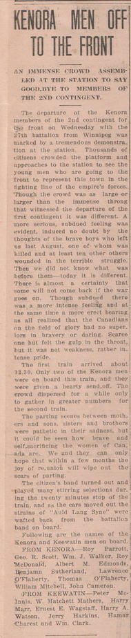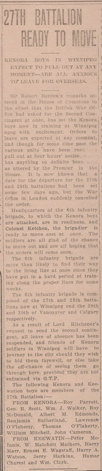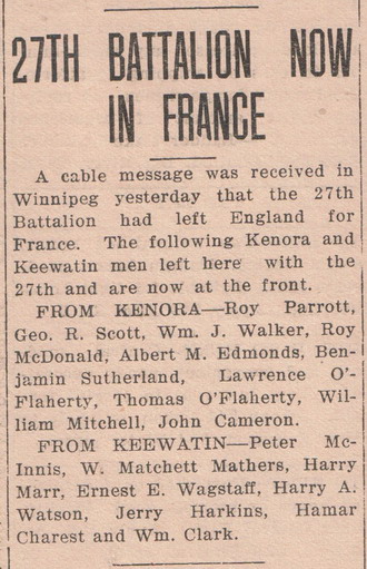 With previous military experience of 6 years with the 69th Regiment Annapolis and having spent three months in Halifax Military School of Instruction, Ernest enlisted in Kenora, Ontario on 22 October 1914. With brown hair and eyes, he was 34 years old. Along with other men of the 27th Battalion, Ernest left Kenora for training in Winnipeg on 1 November 1914 according to an article in the Kenora Miner and News dated 4 November 1914. The 27th (City of Winnipeg) Battalion was the first independent battalion to be raised in Manitoba in the First World War, raised as part of a response to the demand for reinforcements early in 1915 as Canada struggled overseas. Another article in the paper dated 15 May 1915 told of the Battalion passing through Kenora from Winnipeg on 12 May 1915, heading east on the first leg of the journey overseas. On 17 May 1915, the 27th Battalion left Quebec aboard the Carpathian. By 18 September 1915, a cable had been received that the battalion had left England for France. On 1 July 1915, Ernest's appointment as Lance Sergeant had been confirmed, and he was promoted to Sergeant on the 11 September 1915.
