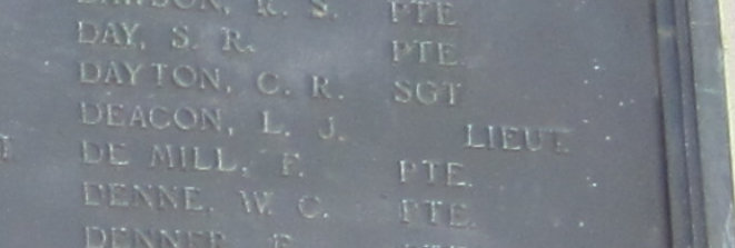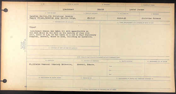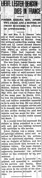 [Private Army Canadian Army Service Corps 2nd Ammunition Sub Park Lieutenant Army Canadian Army Service Corps 5th Divisional Supply Column Lieutenant Army Canadian Army Service Corps 1st Divisional Supply Column The University of Toronto Honour Roll entry for Lester Jerome Deacon says he first enlisted in the 26th Battery of Artillery, then being transferred to the 2nd Division Ammunition Park. After his promotion to Lieutenant in the spring of 1916 he was assigned to the 1st Division Supplu Column, and at the time of his death was with the 5th Calvary Divisional Supply Column. ]