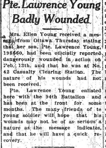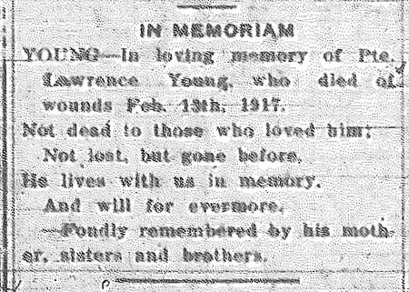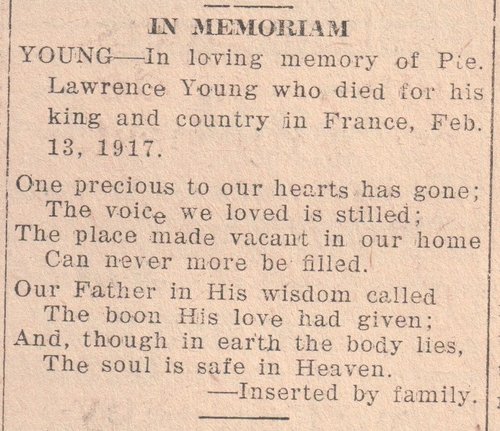 Lawrence's attestation paper has his birth date as 24 March 1898 but on his birth registration it's recorded as 15 February 1899, Algoma County, Ontario (Archives of Ontario. Registrations of Births and Stillbirths – 1869-1913. MS 929, reel 147, District of Algoma, 1899, fo. 338. Archives of Ontario, Toronto). His parents had a child who died in December 1897 at age two days, so a March 1898 birth date for Lawrence would not be possible.