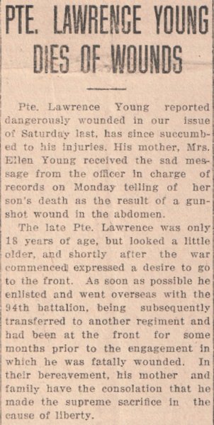 Throughout most of the war regulations required soldiers to be at least 19 years old before they served in front line units but thousands of young Canadians enlisted underage, most by giving a false date of birth, and many of them were killed in action or died of wounds. Private Lawrence Young enlisted just before he turned 17 and he died a year later, two days before his 18th birthday.