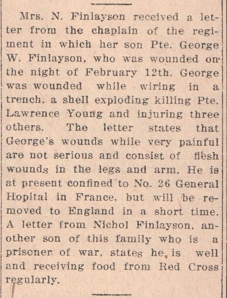 The Somme has been called the graveyard of armies and in less than three months there the Canadian Corps suffered 24,000 casualties. Over the winter of 1916-17 the battalions received reinforcements to bring them back up to strength. Time was spent training, repairing trenches, building dugouts, providing working parties and carrying out raids on the German lines. The weather was cold and wet, with almost constant rain and occasional flurries of snow. From the war diary of the 42nd Battalion, 1917, "February 8th to 12th. In the trenches. Work was carried on enlarging and improving deep dugouts, repairing trenches, etc. Due to the extreme cold weather and frozen condition of the ground little work could be done rivetting. Special parties were engaged nightly in wiring the P Line and entrances to the Tunnel. On the afternoon of the 12th 1 O.R. was killed and 4 O.R. wounded by a direct hit on trench P.75. The same night 1 O.R. was killed and 2 O.R. wounded while wiring along P 78 by an enemy dart." Lawrence was one of the casualties that day, suffering a serious wound to his abdomen. In a letter to Mrs. Finlayson the battalion's chaplain said Lawrence was wiring a trench with Nichol's brother George Finlayson when an artillery shell exploded nearby. He was evacuated to a casualty clearing station and he died the following day, 13 February. From the CEF Commonwealth War Graves register for Lawrence: Died of Wounds (Previously reported Dangerously wounded) No. 42 Casualty Clearing Station, Gun Shot Wound Abdomen.