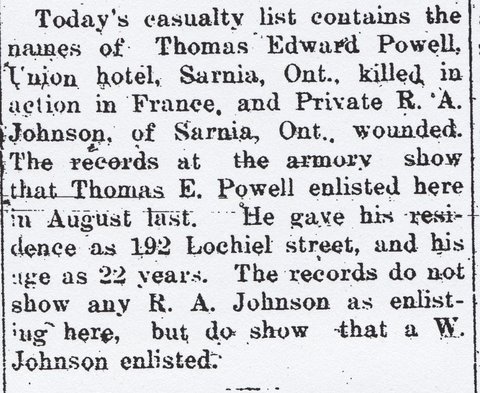 Next of kin: Edwin Powell 192 Lochiel St. Sarnia, Ontario
