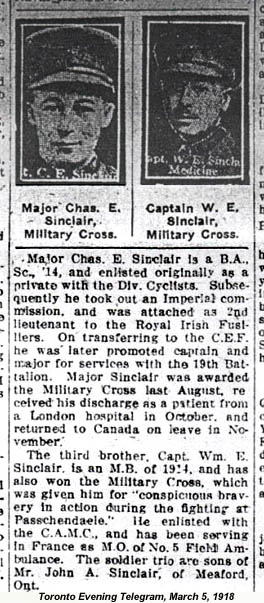 Uploader's Research notes: Enlisted originally as a Private with the Div. Cyclists, later attached as 2nd Lt. with the Royal Irish Fusiliers. Transferred to the 19th Bn. CEF. Brother was Capt. William E. Sinclair. [Major Army Canadian Infantry 19th Battalion Military Cross ]