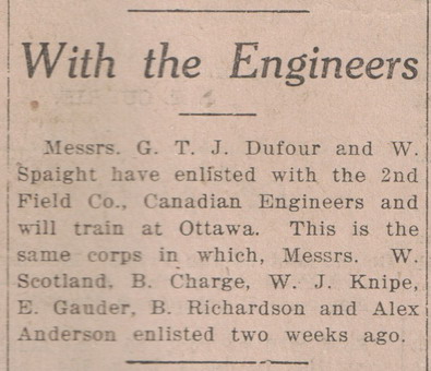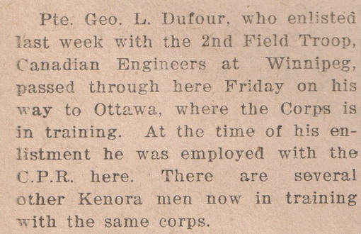 With occupation given as trainman and his next of kin as his wife Eva Belle, George signed his attestation papers in Winnipeg on 28 February 1916. Two Kenora Miner and News paper articles spoke of his enlistment with the 2nd Field Troop, Canadian Engineers and his passing through Kenora on his way from Winnipeg to Ottawa to train with the Corps.