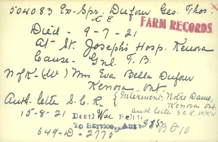 On 09 July 1921 George died in the St Joseph's Hospital in Kenora, cause of death given as tubercular laryngitis. He is interred in the Lake of the Woods Cemetery, Kenora. The plaque and scroll and memorial cross were sent to Eva in Kenora but it appears that she and the children did not remain in the town. A family tree on ancestry suggests that Eva died in Timmins, Ontario in 1952, followed by daughter Rae (Barron) in 1983.
