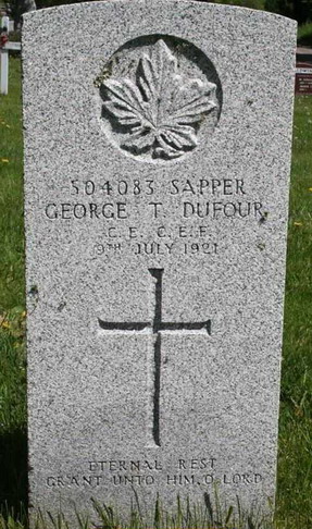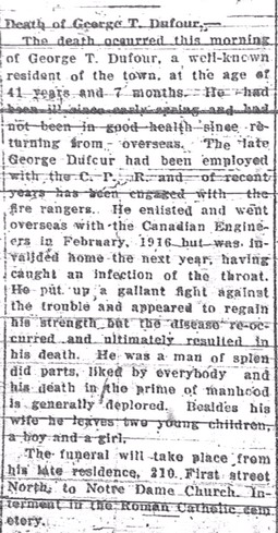 The son of Thomas and Mary (Graham) Dufour, George Thomas Dufour was born on 20 October 1879 in Mattawa, Ontario. According to the 1891 Canada census, both of his parents were born in Quebec but by the birth of their first child, a daughter Celia in 1875, the family was living in Mattawa. Another son, William, was born in 1885. For the 1891 census for Mattawa, Thomas was listed as a general labourer while Celia was apprenticing as a dressmaker.